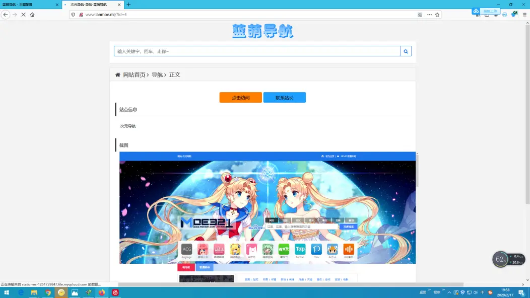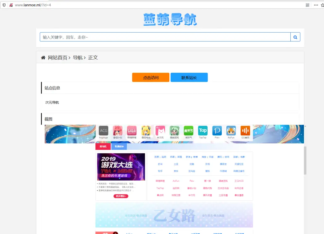 至此,导航网站搭建完成,http://www.lanmoe.ml/ ,已知所有实用网站已全部收录。 该源码简洁实用,拥有点击访问 联系站长 站点信息(简介)网站截图(快照)功能,可分类等优点。欢迎小伙伴带上自己的网站,让更多的人看到。( • ̀ω•́ )✧